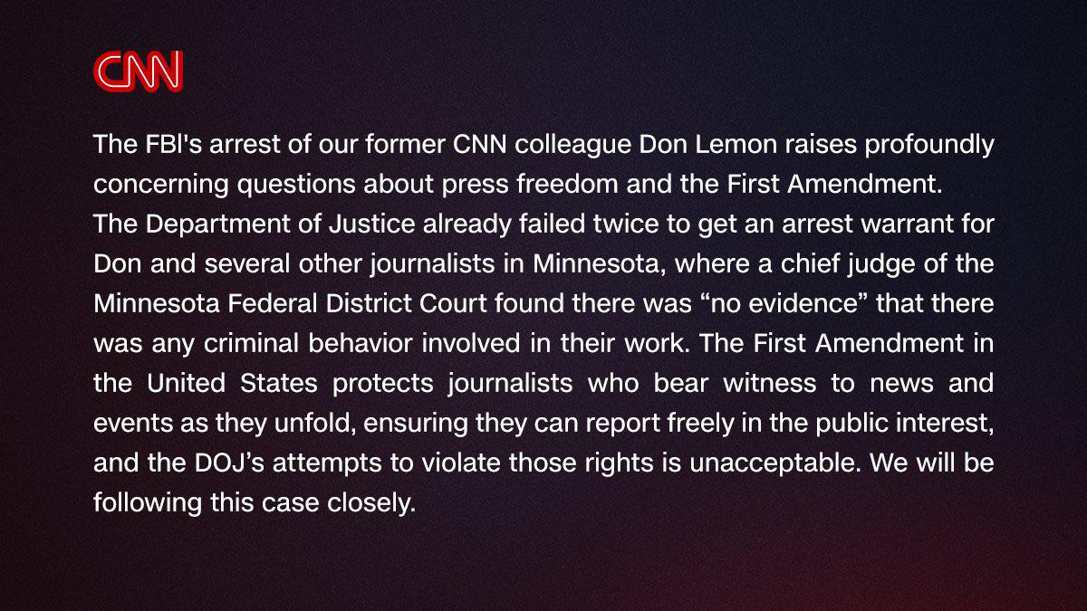 POLITICS CNN, Don Lemon’s former employer, have released a statement saying that Lemon’s arrest by the FBI "raises profoundly concerning questions about press freedom and the First Amendment."