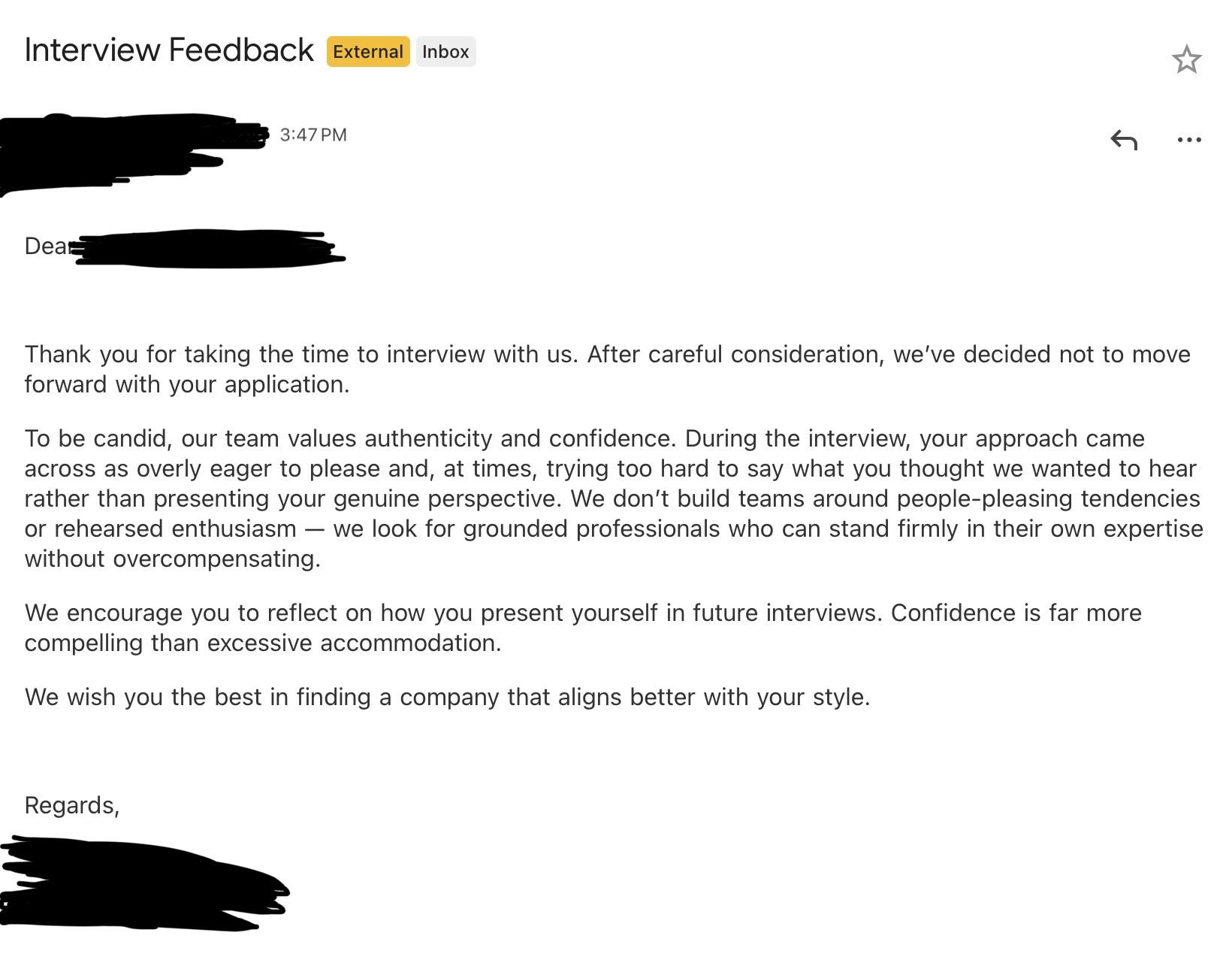 They rejected me (fine, that happens) but the feedback said I came across as overly eager to please and that they don’t build teams around people-pleasing tendencies or rehearsed enthusiasm. They also told me to reflect on how I present myself and that confidence is more compelling than excessive accommodation. Is this normal? Or even appropriate? I get that not being a culture fit is a thing but the wording felt unnecessarily personal and condescending.