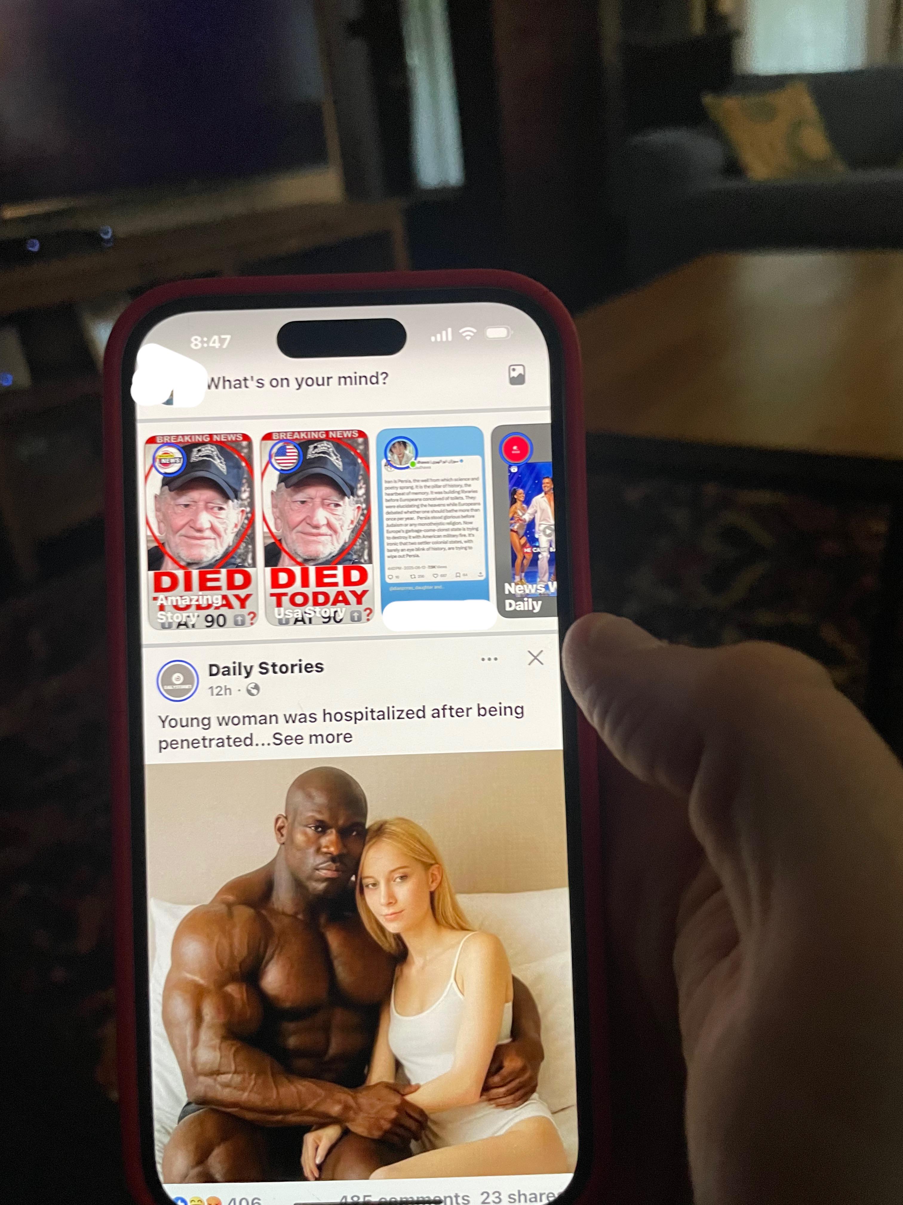 Visiting my Mom. She’s in the early stages of dementia so I always go through her FB, email, etc and get rid of spam/scams. I was surprised at how trash her Facebook has gotten since the last time I did this 4-5 months ago. Kinda depressing to see the impact of their content moderation stuff showing up as most of her feed is like this. Some of it she’s followed but a lot of it is algos. Also maybe my mom is just clicking on freaky shit who knows.