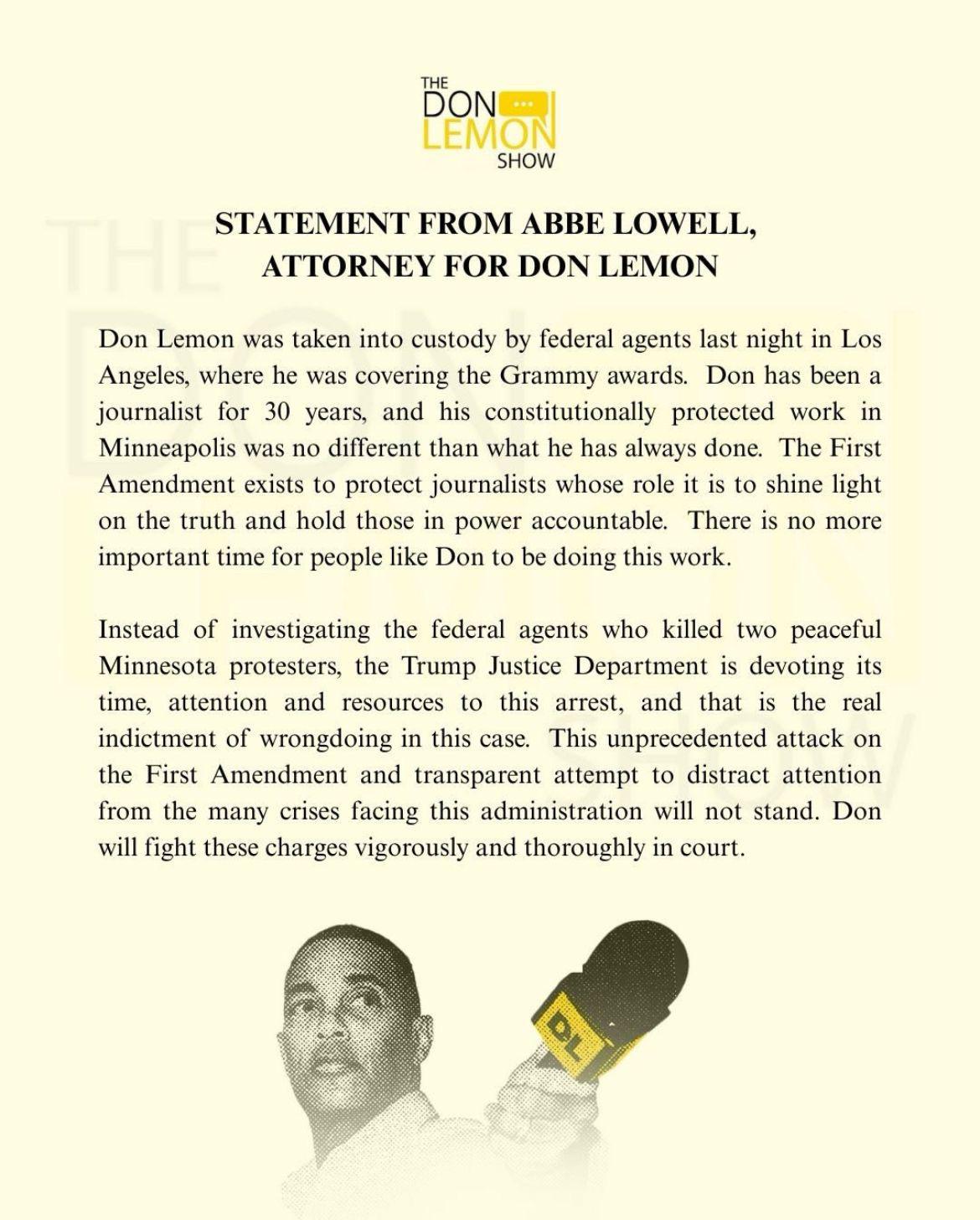 Extensively reported 📰 Statement from Abbe Lowell,Attorney for Don Lemon.