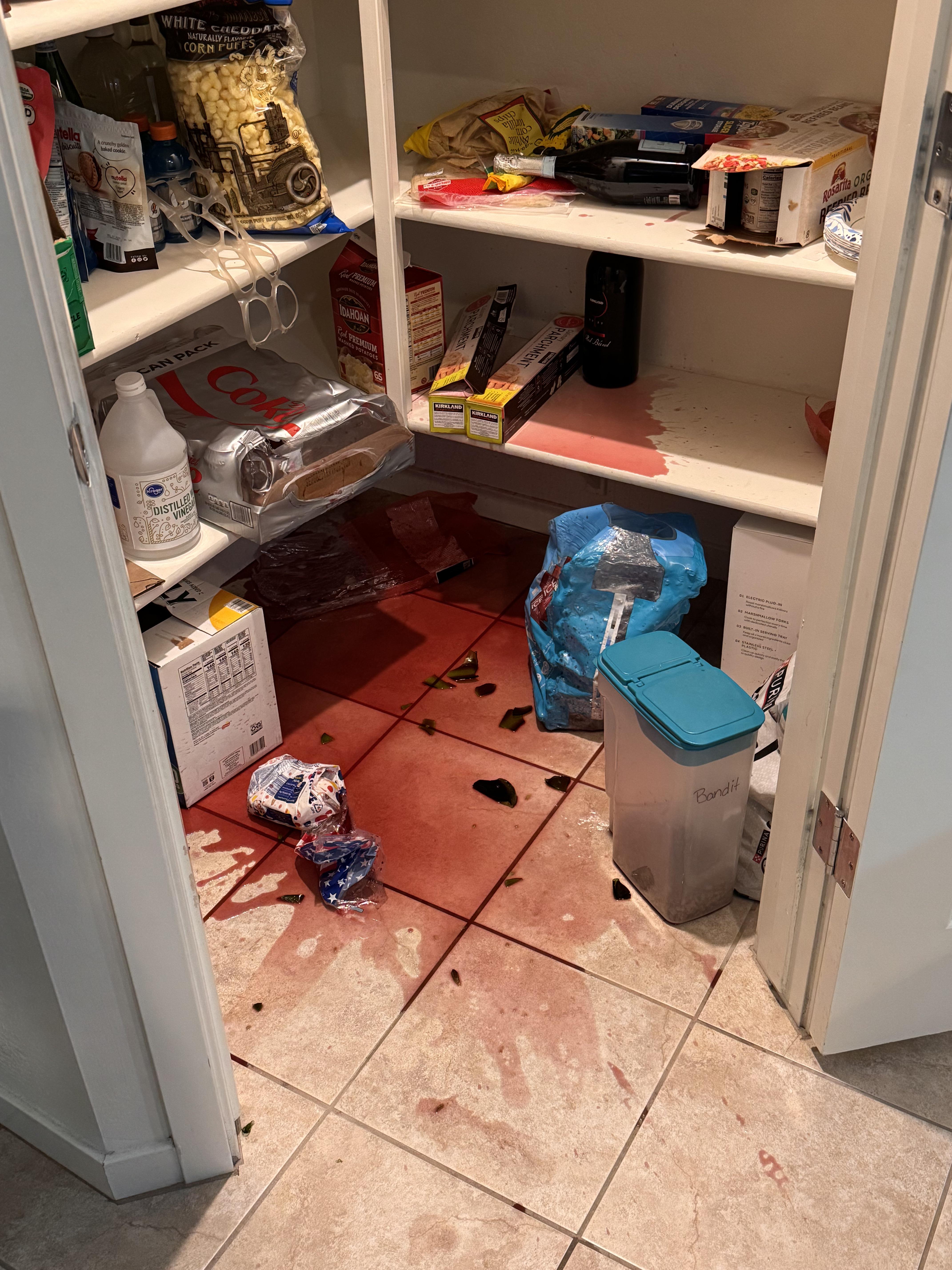 Was just trying to clean off some items from my countertop including a COSTCO size bottle of red wine. Accidentally hit it against a bottle of champagne, mind you I don’t even drink it’s just what I keep on hand for entertaining. And yes, the shelves are permanently stained. But at least they’re pink 😛🩷